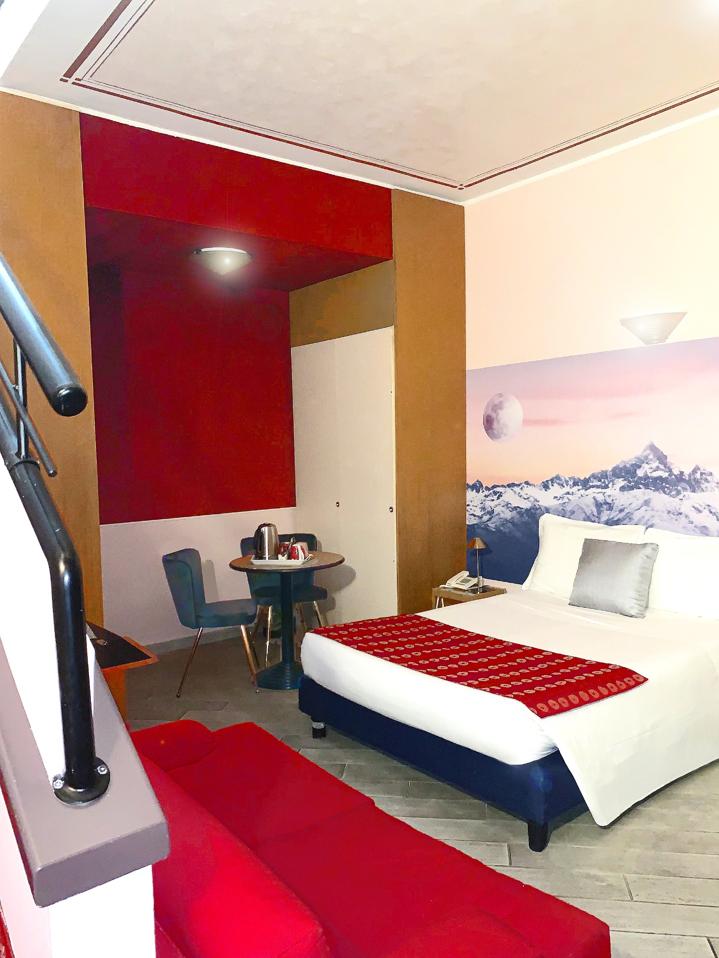 La Junior Suite Monviso rende omaggio alla montagna più celebre del Piemonte: la sua inconfondibile sagoma del 're di pietra' rivive in un’esclusiva opera fotografica stampata su carta da parati, trasformando la stanza in un ambiente suggestivo e unico. A completare l’esperienza, un balcone con tavolino e sedie invita a rilassarsi e a vivere l’atmosfera autentica di un caratteristico interno cortile torinese, magari gustando la prima colazione in totale tranquillità.